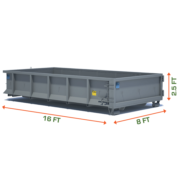We offer a lot of different sized bins as we hope that by providing the size you need, rather than charging for a bigger bin or extra emptying fees, we can help you stay within your budget. There is a 12 cubic yard bin image on our website with listed measurements if you would like a visual but the 12 yard bin dimensions at Trash King are 16 feet long by 8 feet wide by 2.5 feet tall. The 12 yard bin size is great for home removal, as it will fit in most driveways but can still hold a respectable amount of waste. If you are cleaning up the yard, clearing out reno leftovers, or spring cleaning, this bin will provide more than enough space while remaining compact enough to keep on your property without limiting your function. Having a hard time translating the measurements and asking yourself, how big is a 12 yard bin? The amount of waste these bins can hold is comparable to four pickup truck loads worth of debris.